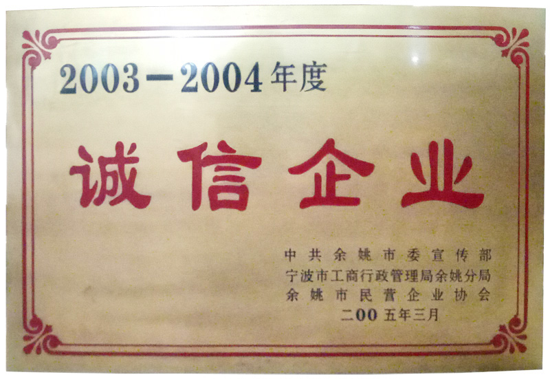 2005年3月,被中共余姚市委宣傳部、寧波市工商行政管理局余姚分局、余姚市民營企業(yè)協(xié)會聯(lián)合評定為2003-2004年度“誠信企業(yè)”
